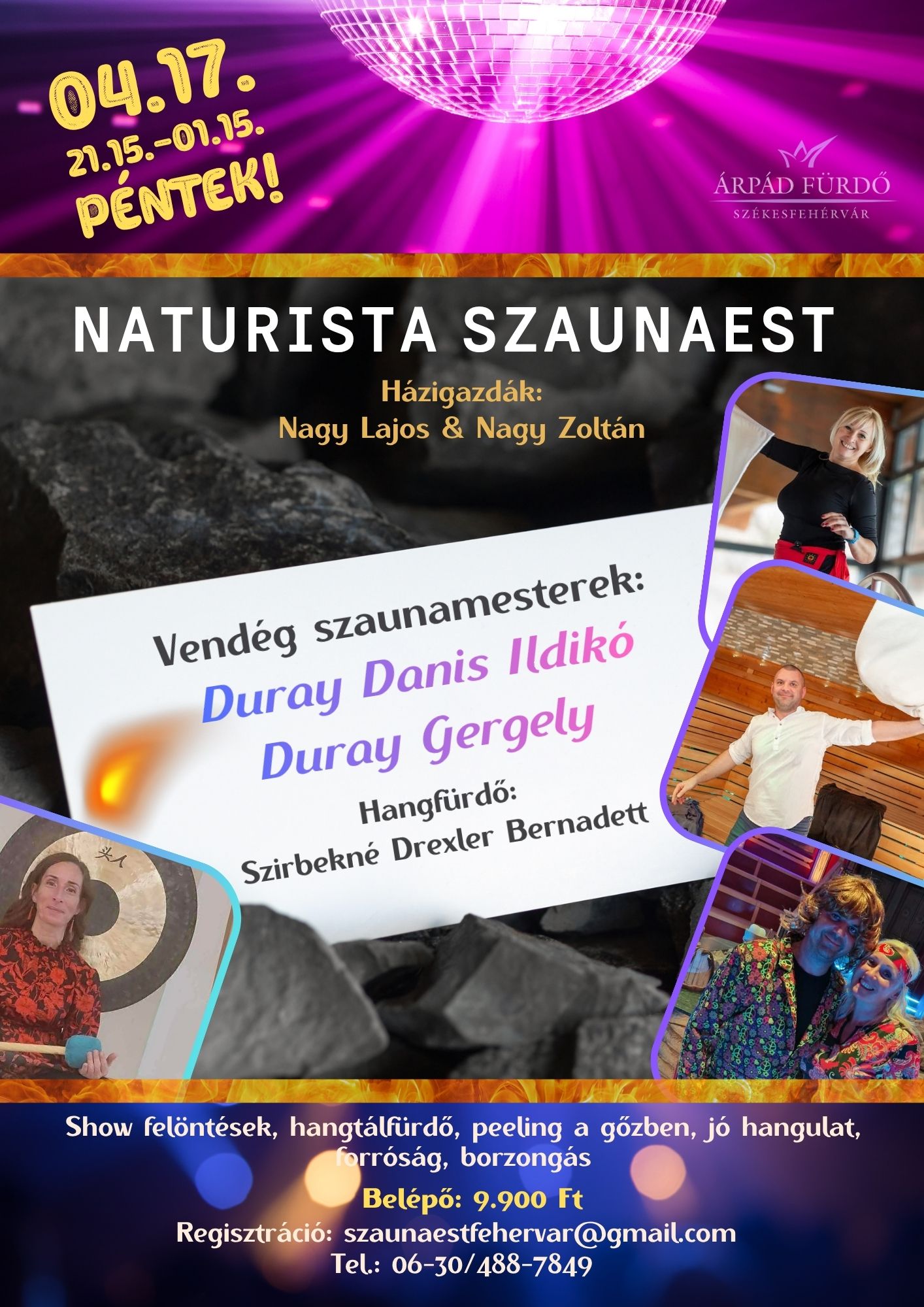 Vendég szaunamesterek: Duray Gergely és Duray Danis Ildikó– virtuóz kezű szaunamester pár, valamint Szirbekné Drexler Bernadett- hangtálfürdő